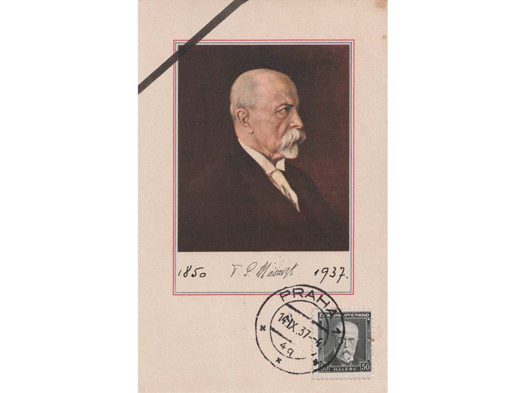 Pamětní razítko, 1937, Praha, T.G. Masaryk, propagační pohlednice zasl. do Opavy, skvrnka