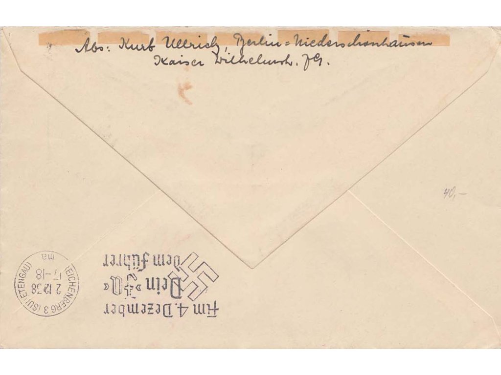 Sudety, 1938, Zeppelin Sudetenland, dopis vyfr. pestrou frankaturou, DR Frankfurt + příchozí Reichenberg, všechny náležitosti, stopy poštovního provozu