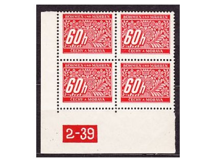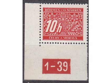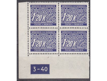 Poštovní známky, 1939, 1.20 K doplatní, kompletní 50 kusový arch s DČ 4-40 (Lx, Px), obvyklé archové lomy - viz. foto, cena v katalogu Pofis proškrtnuta - není uvedena ani teoreticky, vzácné, Nr.10, luxusní sběratelská kvalita - **