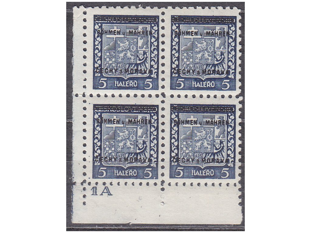 Poštovní známka 1939, 5h Znak, roh. 4blok s DČ 1A, Nr.1, **