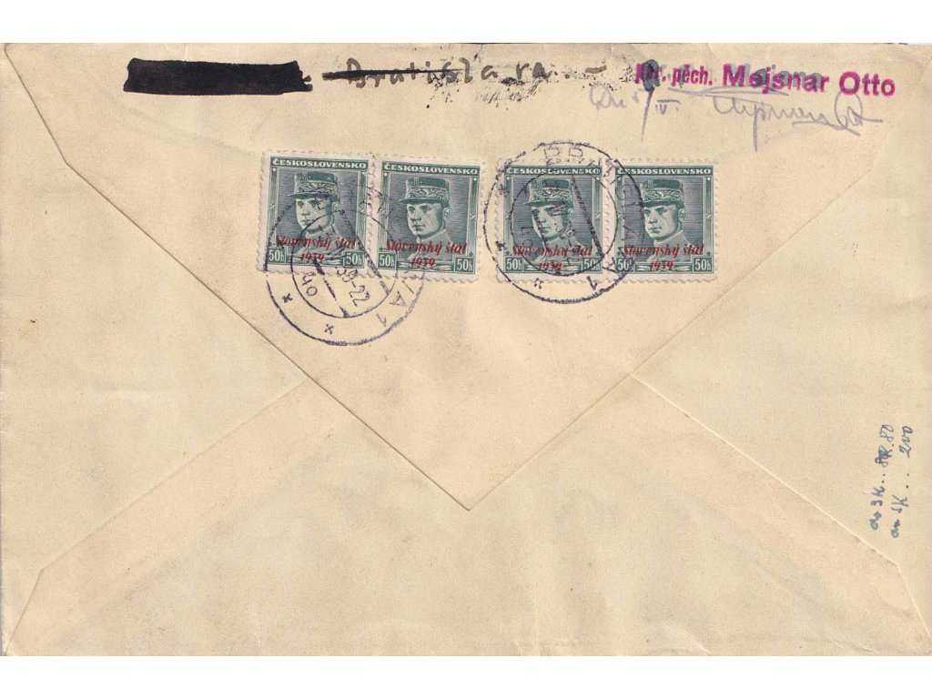 Poštovní celistvost, 1939, DR Bratislava, R-Ex dopis zasl. do Prahy, dekorativní frankatura, stopy stáří a poštovního provozu - viz. foto
