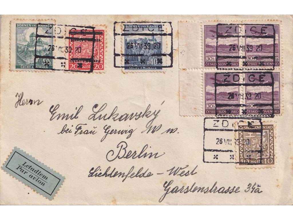 Poštovní dopis, 1939, DR Zdice 26.8., let. dopis zasl. do Berlína, hezká frankatura, horší jakost - viz. foto