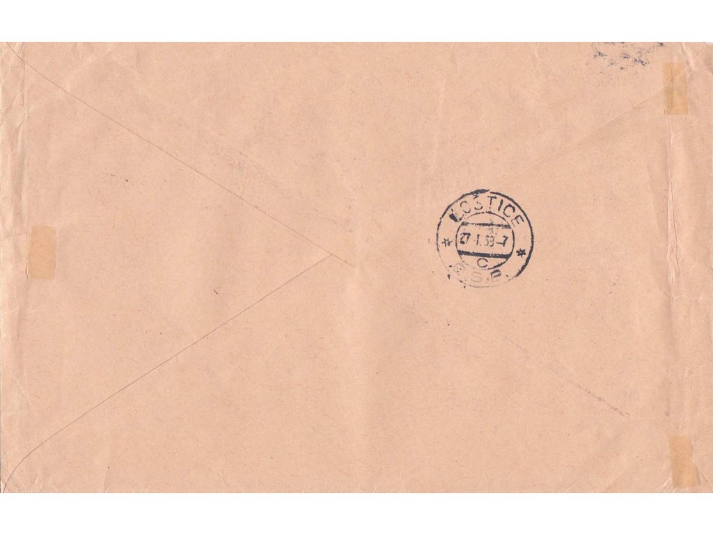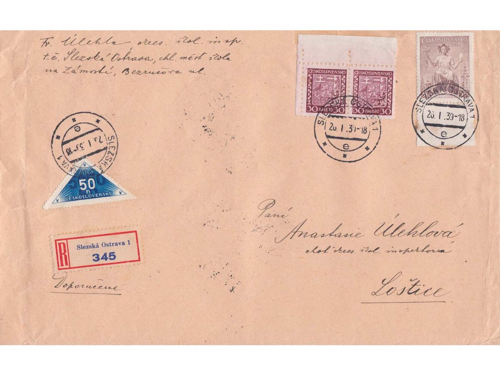Poštovní celistvost, 1939, R-dopis vyfr. pestrou frankaturou známek + 50 h modrá Doruční, DR Slezská Ostrava 26.1.1939, zasl. do Loštic, formát A5, omačkání, stopy stáří a poštovního provozu - viz. foto, hledaná frankatura