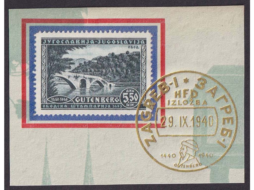 Poštovní známka, 1940, 5.50 Din Filatelistická výstava, MiNr.428, razítko FDC, pamětní list, malý formát