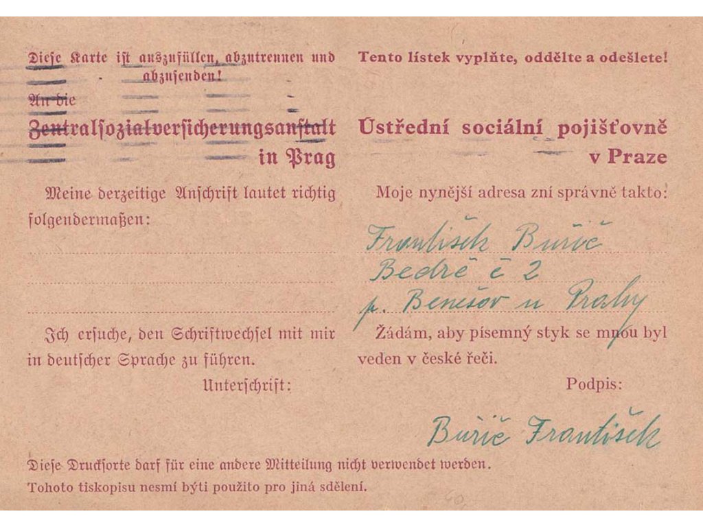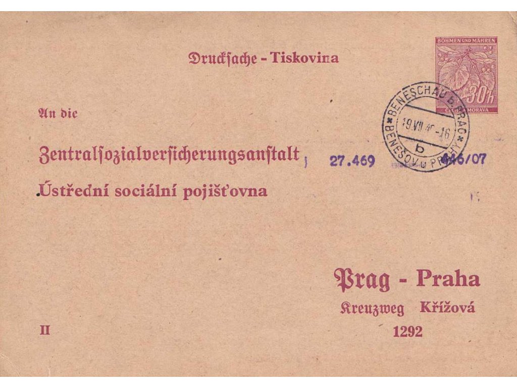 Poštovní dopisnice, 1940, dopisnice Ústřední sociální pojišťovny, DR Benešov, zasl. v roce 1940 do Prahy, lehká omačkání