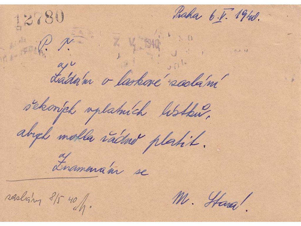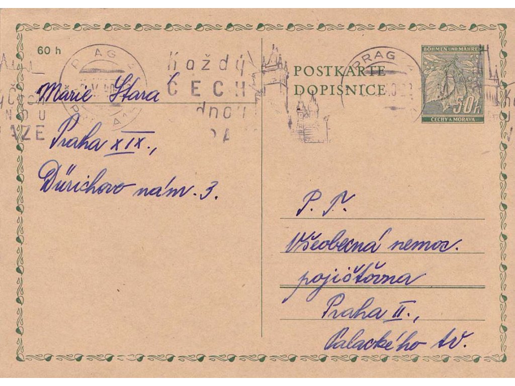 1940, DR Prag, Každý Čech jednou v Praze, dopisnice 50 h Ratolest, prošlé