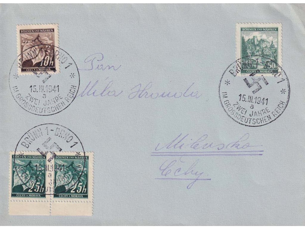 Pamětní razítka, 1941, Brno, 2. výročí Protektorátu, dopis zasl. do Milevska