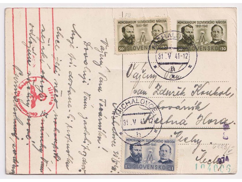 Celinová pohlednice, 1941, celinová pohlednice Memorandum dofr. zn. 50h a 1K, DR MIchalovce, zasl. v roce 1941 do Protektorátu, cenzura, lehká omačkání a stopy pošt. provozu