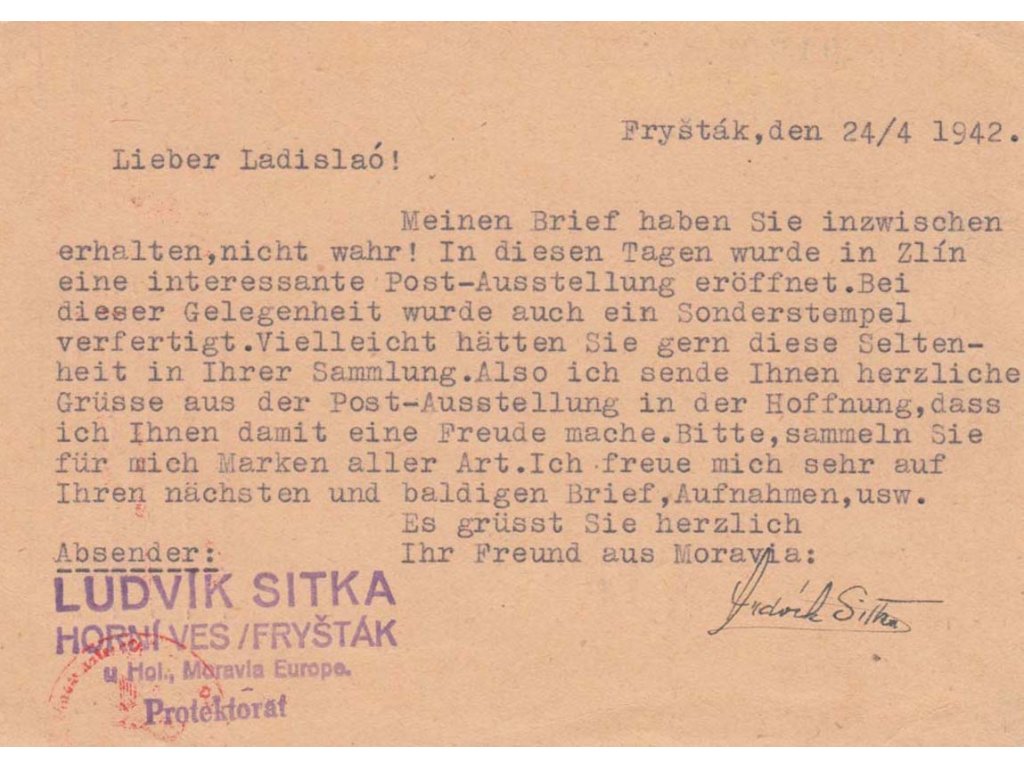 Pamětní razítko, 1942, firemní lístek vyfr. pestrou frankaturou známek, pamětní razíko Zlín, Poštovní výstava, zasl. v roce 1942 do Maďarska, lehké stopy po nálepkách - viz. foto, stopy stáří a poštovního provozu