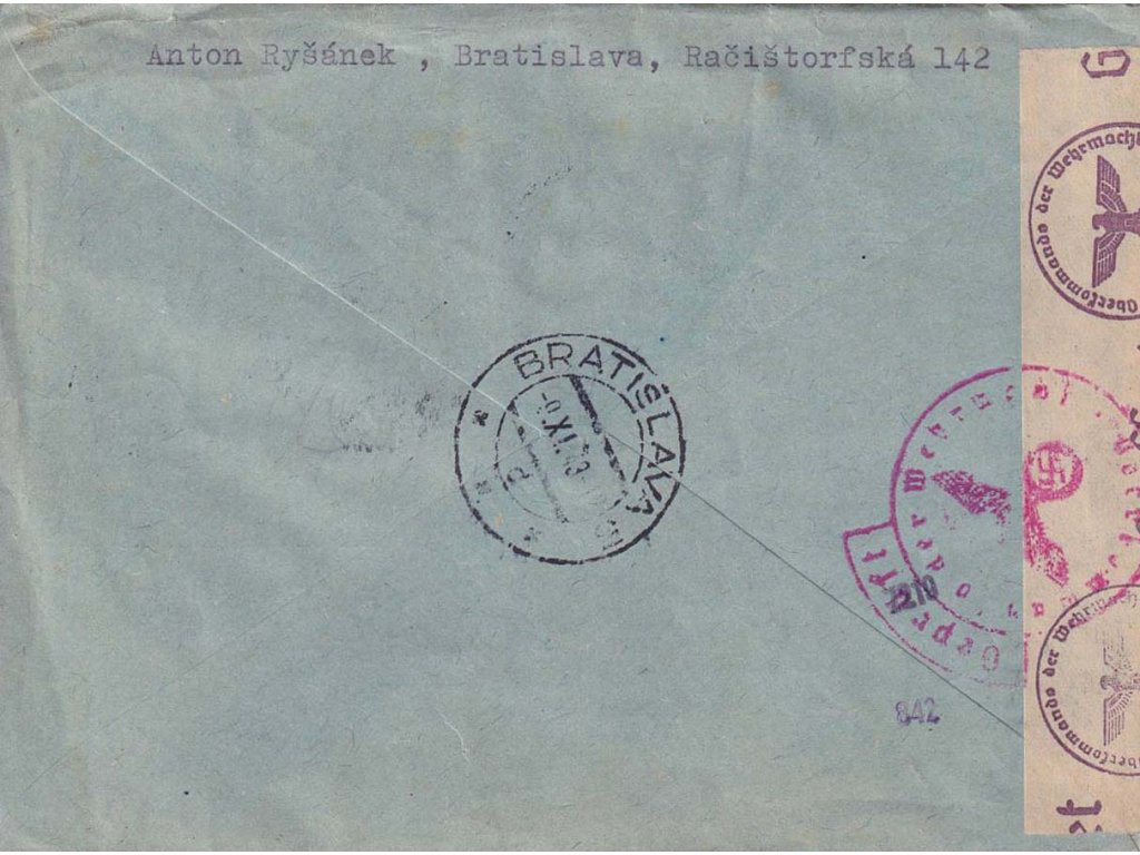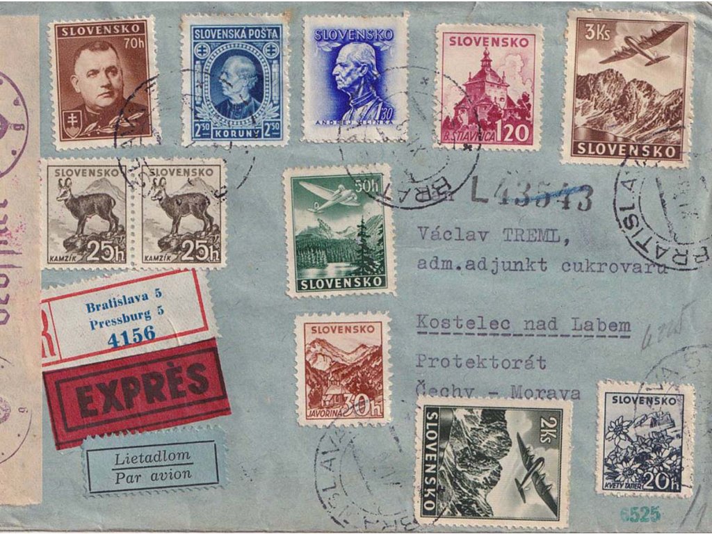 Poštovní celistvost, 1943, DR Bratislava, R-Ex-let. dopis zasl. do Protektorátu, hezká frankatura, cenzury, všechny náležitosti, stopy poštovního provozu - viz. foto