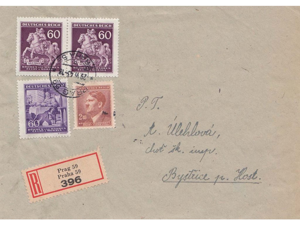 Poštovní celistvost, 1943, DR Praha, R-dopis zasl. do Bystřiček, stopy pošt. provozu, na rubu lehké *