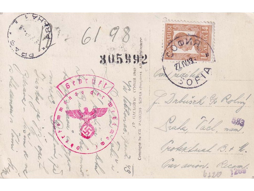 1943, DR Sofia, pohlednice zaslaná v roce 1943 do Protektorátu, cenzura,