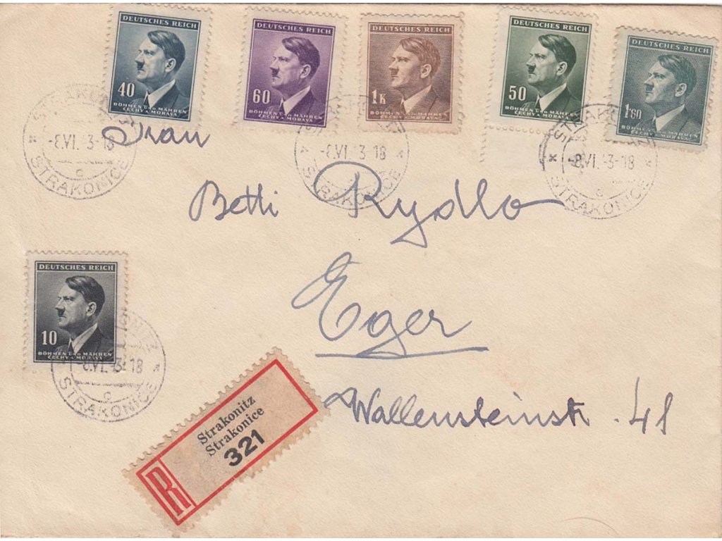 Poštovní dopis, 1943, DR Strakonice, R-dopis zaslaný do Chebu, příchozí razítko, stopy stáří a poštovního provozu