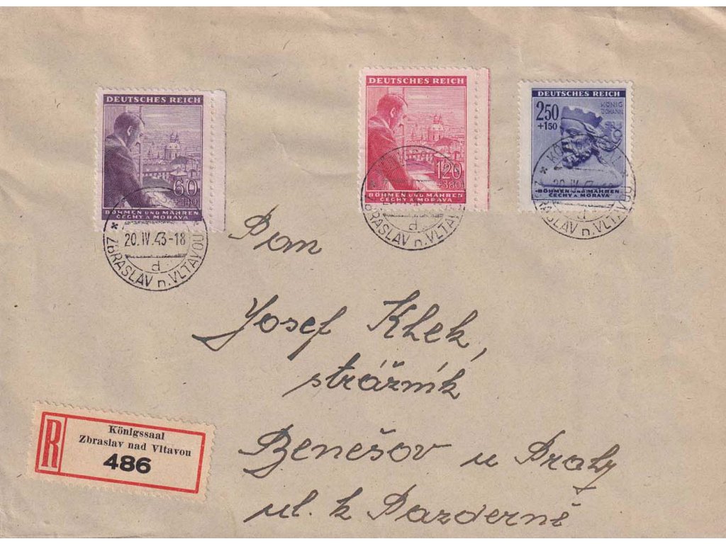 Poštovní celistvost, 1943, DR Zbraslav nad Vltavou, R-dopis zasl. do Benešova, hezká frankatura, lehká omačkání a stopy pošt. provozu