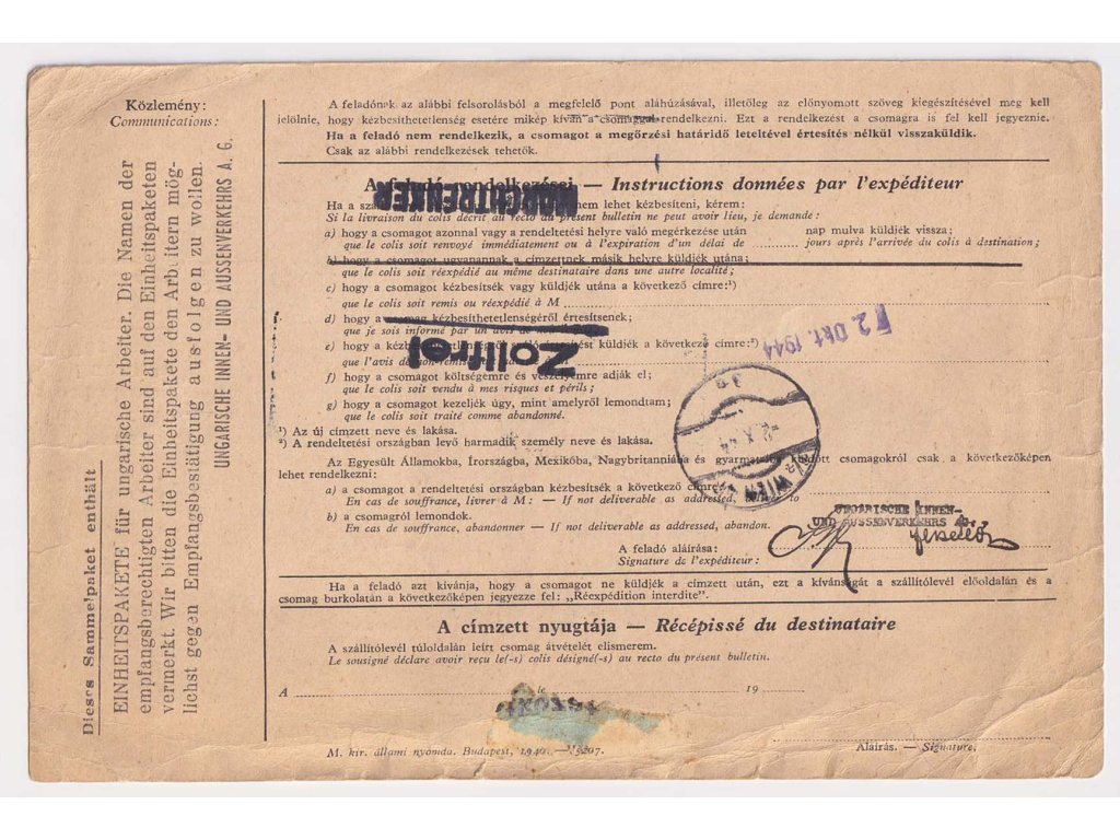1944, celinový poštovní formulář 10 f, prošlé v roce 1944 z Maďarska