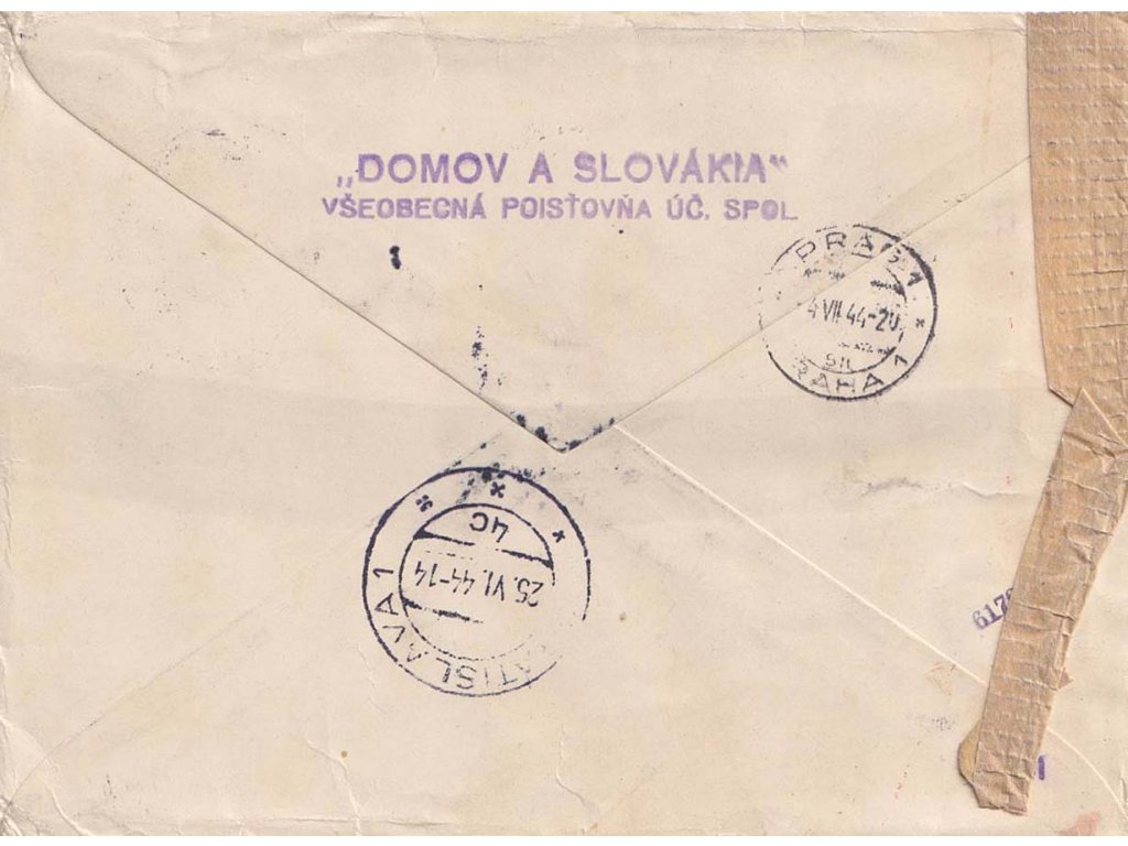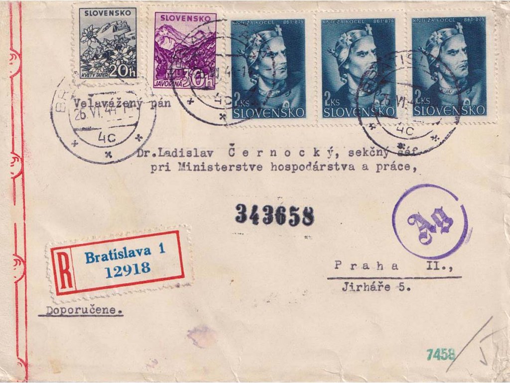 Poštovní celistvost, 1944, DR Bratislava, R-dopis zasl. do Protektorátu, pestrá frankatura, cenzury, horší jakost