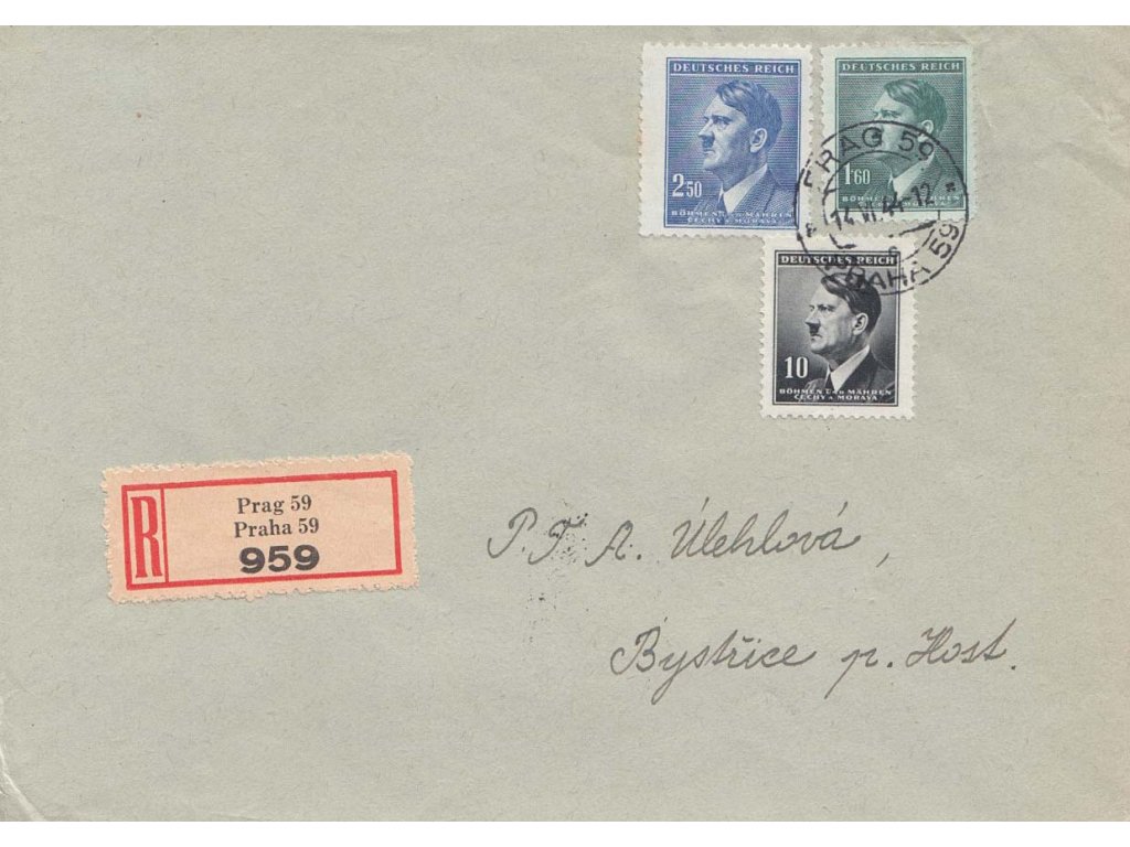 Poštovní celistvost, 1944, DR Praha, R-dopis zasl. do Bystřice, stopy pošt. provozu