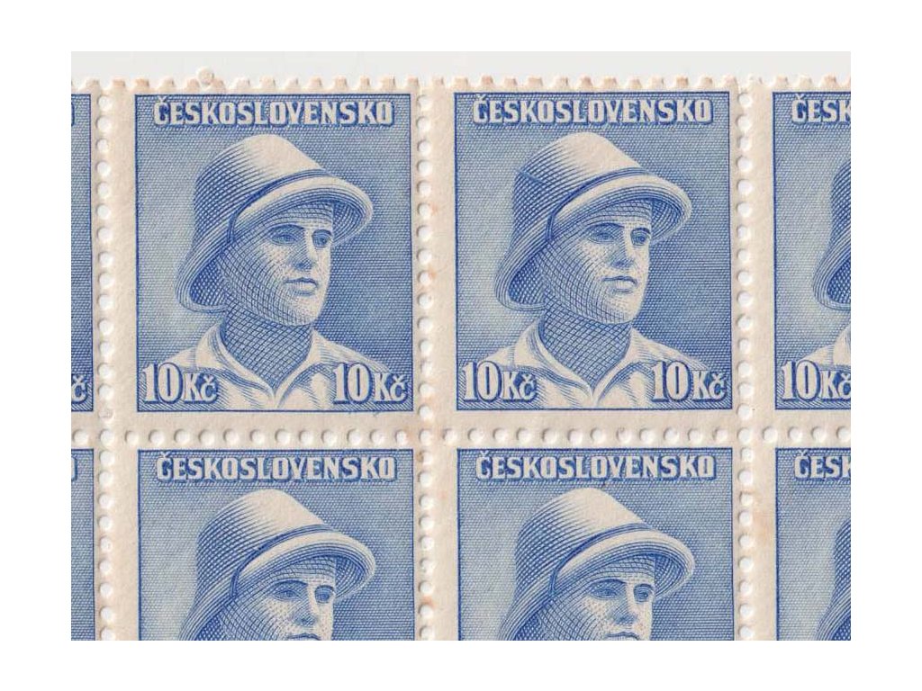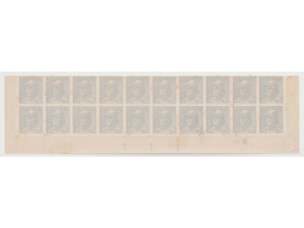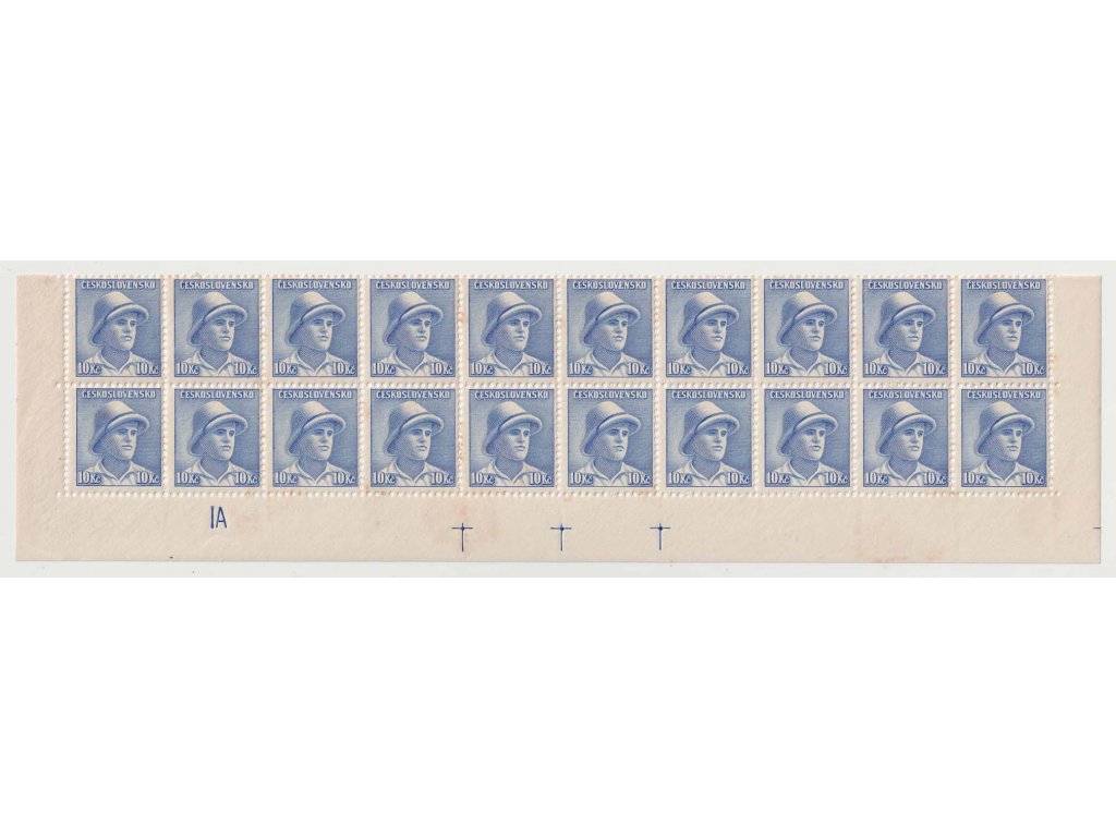 Poštovní známka, 1945, 10 Kč Londýnské vydání, desková vada (DV) - péro v klobouku, kompletní 20pás s deskovou značkou, rezavé skvrnky! - viz. foto, velmi hledaná desková vada, katalog Pofis Nr.402, kvalita - **