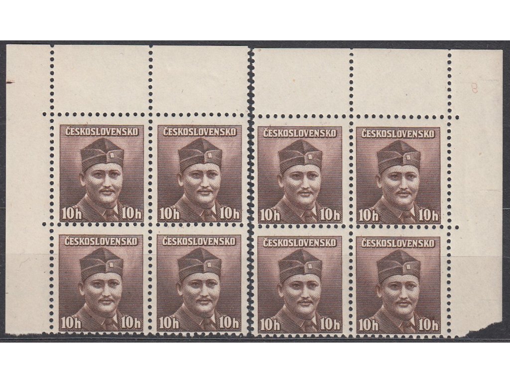 Poštovní známka 1945, 10h Londýnské, L+P rohový 4blok s lehkým posunem perforace a DZ "8", Nr.387, **