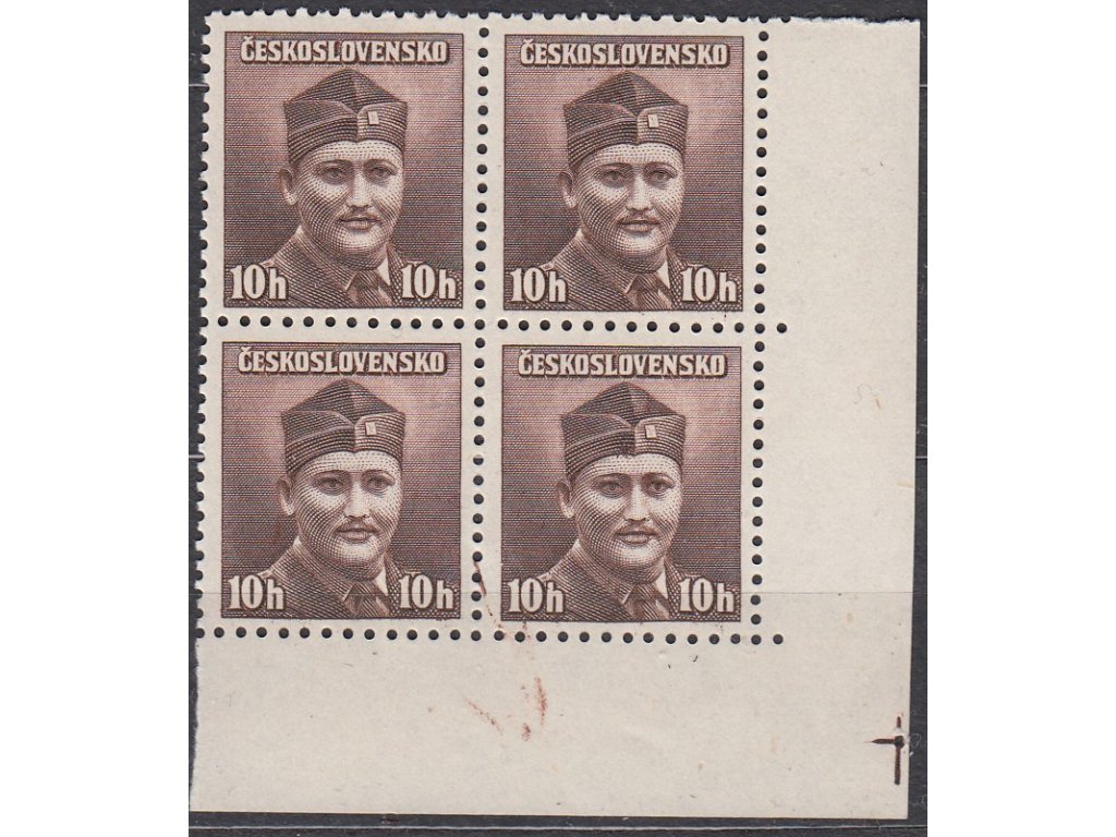 Poštovní známka 1945, 10h Londýnské, rohový 4blok s VV - šmouhy mezi zn. a na okraji, Nr.388, **