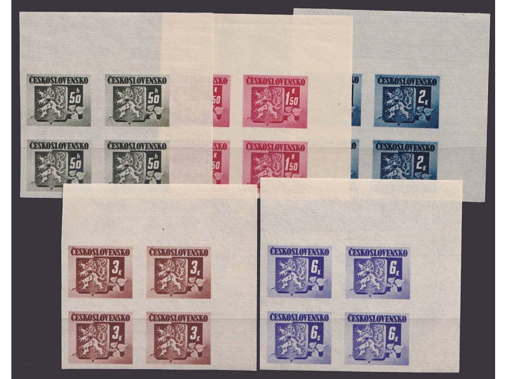 Poštovní známky, 1945, 50h-6K Bratislavské TF (A), 4bloky, Nr.363,365,366,368,370, **