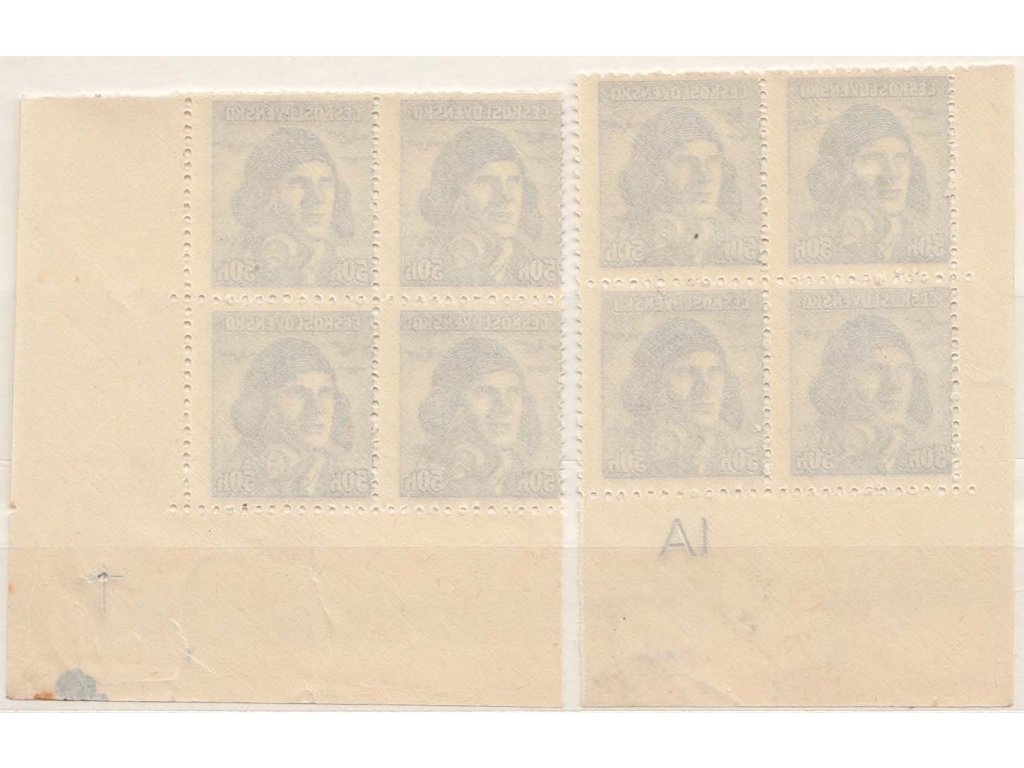 Poštovní známka, 1945, 50h Londýnské, L+P rohový 4blok s posunem perforace, Nr.393, ** , skvrna v okraji