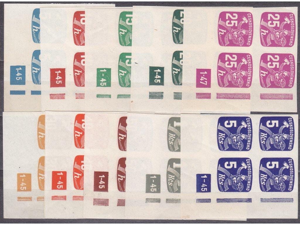 Poštovní známky 1945, 5h-5Kčs Novinové, série v pravém rohovém 4bloku s DČ 1-45, Nr.NV23-32, **