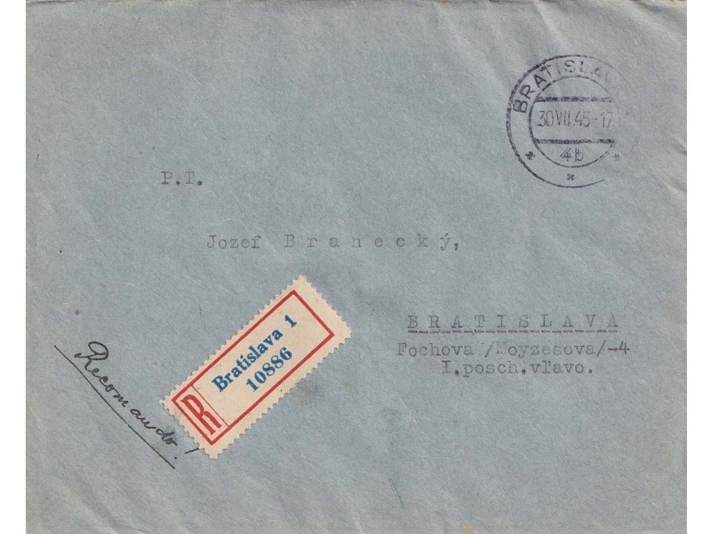 Poštovní dopis, 1945, DR Bratislava, R-dopis vyfr. Košickým aršíkem, zasl. v místě, hezký formát, skutečně poštovně prošlé