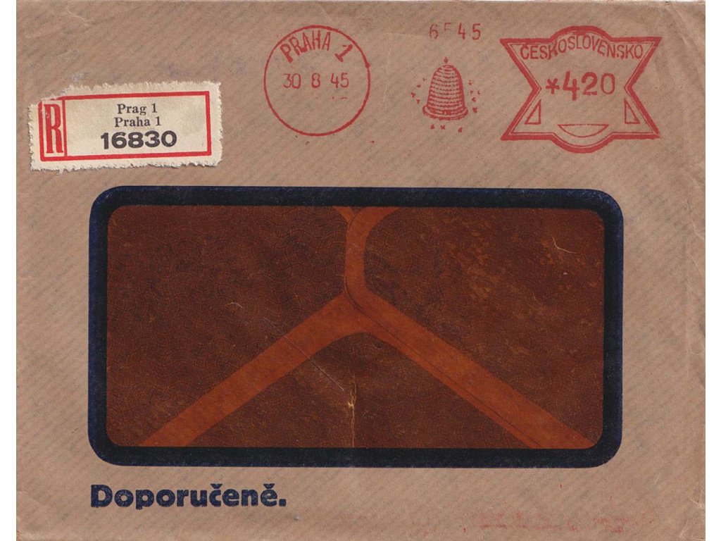 Poštovní celistvost, 1945, DR Praha, frankotyp Živnostenská banka, R-dopis, okénková obálka, stopy poštovního provozu