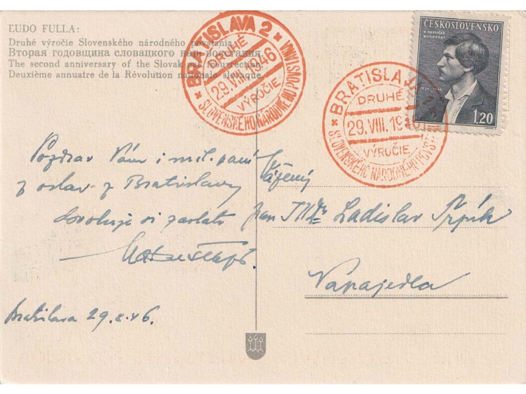 1946, Bratislava, 2. výročie SNP, propagační pohlednice zaslaná do Napajedel