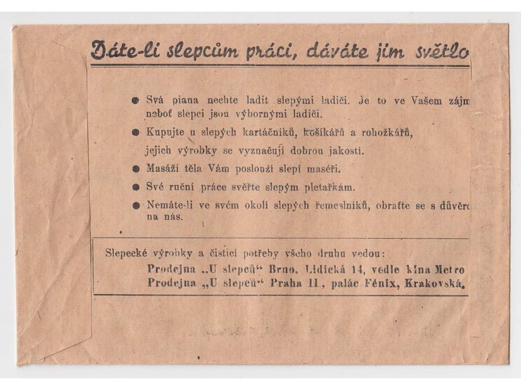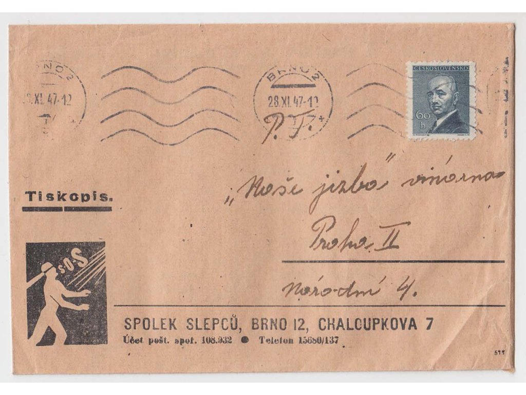 Poštovní celistvost, 1947, Tiskopis Spolku slepců vyfr. zn. 60 h Beneš, razítko Brno, zasl. v roce 1947 do Prahy, lehká omačkání a stopy pošt. provozu