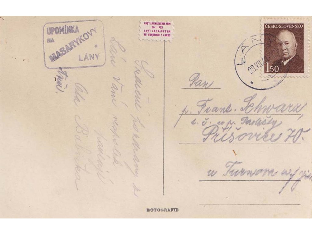 1948, Lány, Upomínka na Masarykovy Lány, pohlednice zasl. do Příšovic