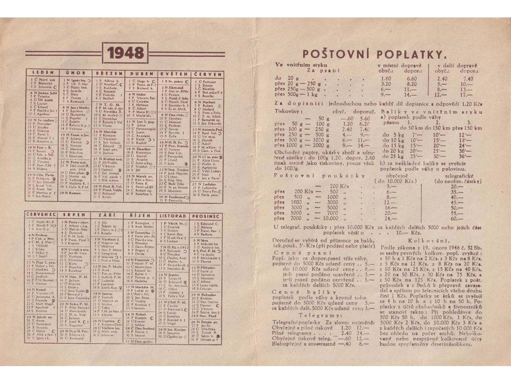 Kalendář, 1948, Mnoho štěstí v roce 1948 přeje listonoš, pohlednicový formát, horší jakost, zachovalé