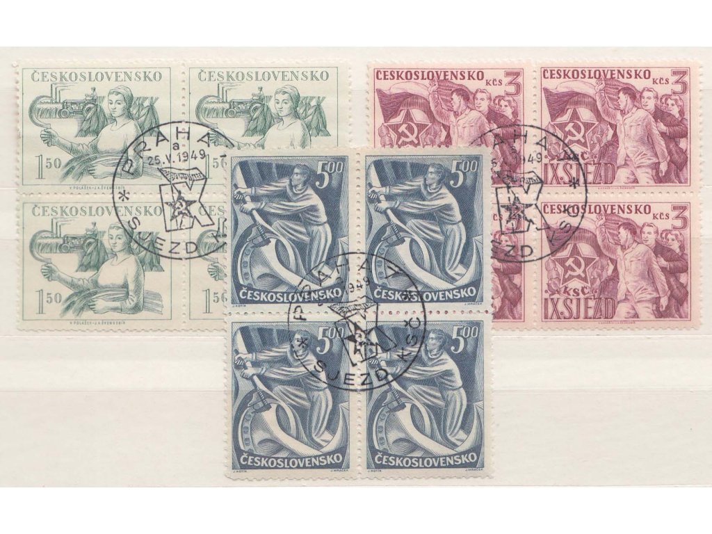 Poštovní známka, 1949, FDC 511-513 IX. sjezd KSČ, razítka FDC na 4blocích, kvalita - */**