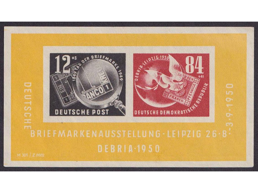 Poštovní známka, 1950, 12-84 Pf aršík DEBRIA, MiNr.Bl.7, */** , stopy po přilepení - viz. foto