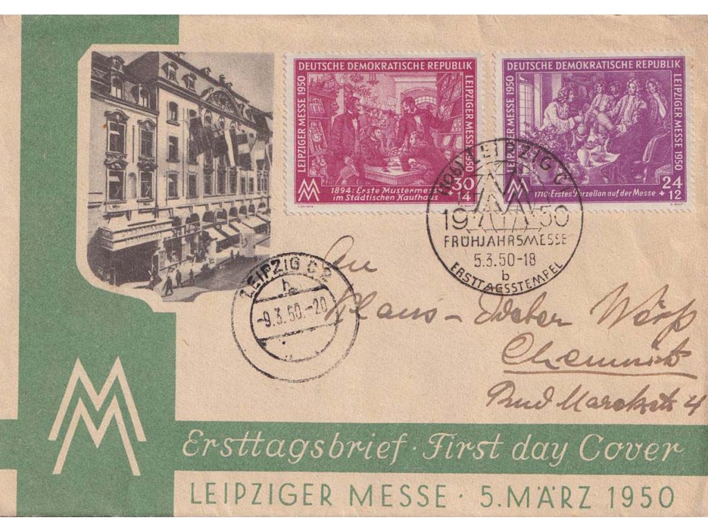 Obálka FDC, DDR, 1950, FDC 248-249 Lipský veletrh, obálka FDC zaslaná v Německu, hezké, lehká omačkání a stopy poštovního provozu