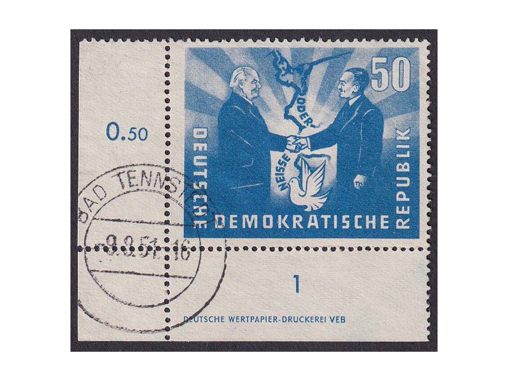 1951, 50 Pf Přátelství, roh. kus s DZ, MiNr.285, razítkované, přeloženo