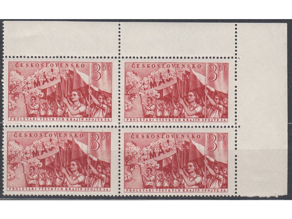 1952, 3Kčs 1.máj, rohový 4blok s vynechanými perf. otvory, Nr.651PV, **
