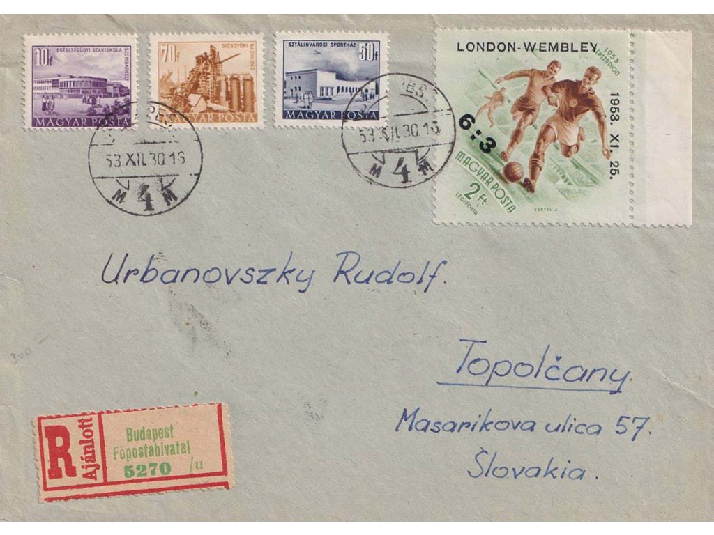 Poštovní celistvost, 1953, DR Budapest, R-dopis zaslaný do ČSR, stopy pošt. provozu, lehké natržení