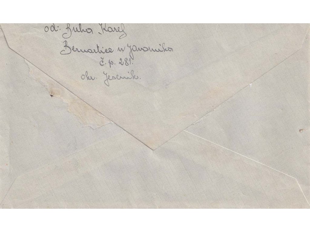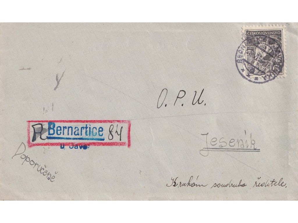 Poštovní celistvost, 1956, DR Bernartice u Javorníka, R-dopis zasl. do Jeseníka, provizorní R-nálepka, stopy poštovního provozu