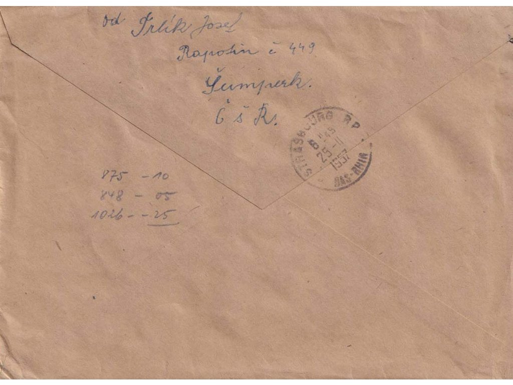 Poštovní celistvost, 1957, DR Vikýřovice, dopis vyfr. pestrou frankaturou zn., zasl. do Francie
