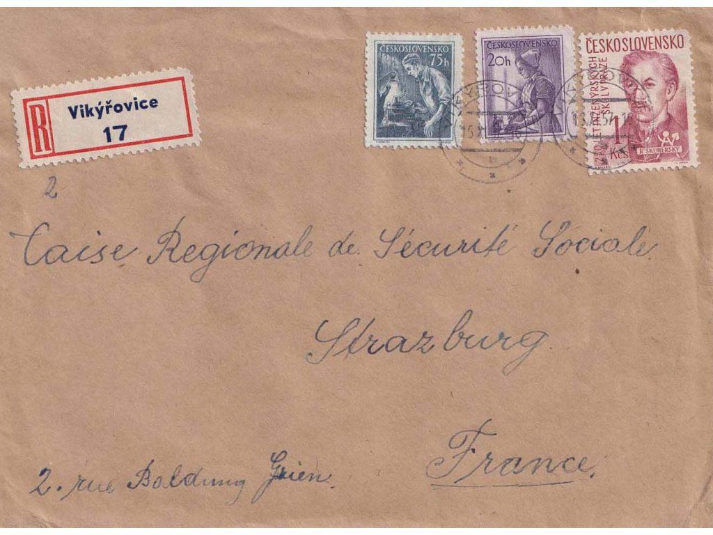 1957, DR Vikýřovice, dopis vyfr. pestrou frankaturou zn., zasl. do Francie