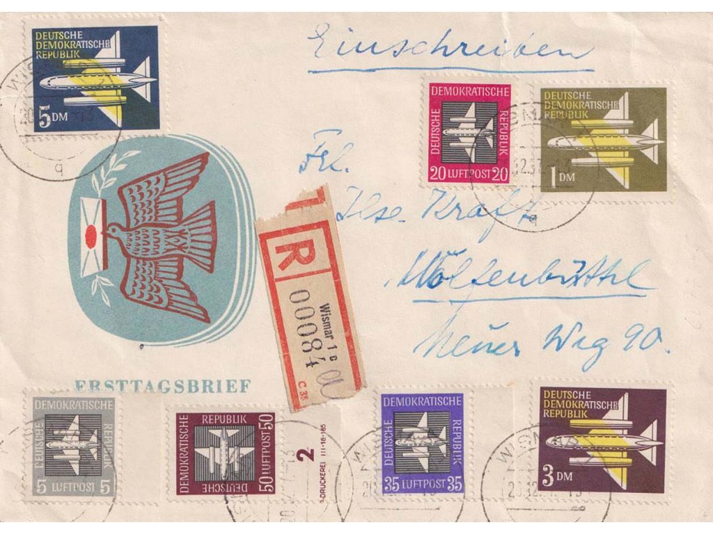 1957, DR Wismar, R-dopis vyfr. pestrou frankaturou leteckých známek,