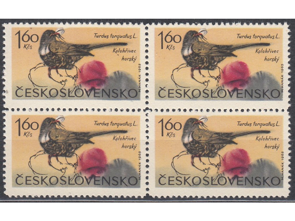 Poštovní známka 1965, 1.60Kčs Ptactvo, 4blok s DV - skvrna pod nápisem "Kolohřivec", Nr.1478, **