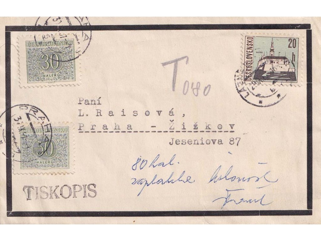 Poštovní celistvost, 1967, DR Lázně Bohdaneč, smuteční tiskopis zasl. do Prahy, zde zatíženo dopl. zn., stopy poštovního provozu a stáří