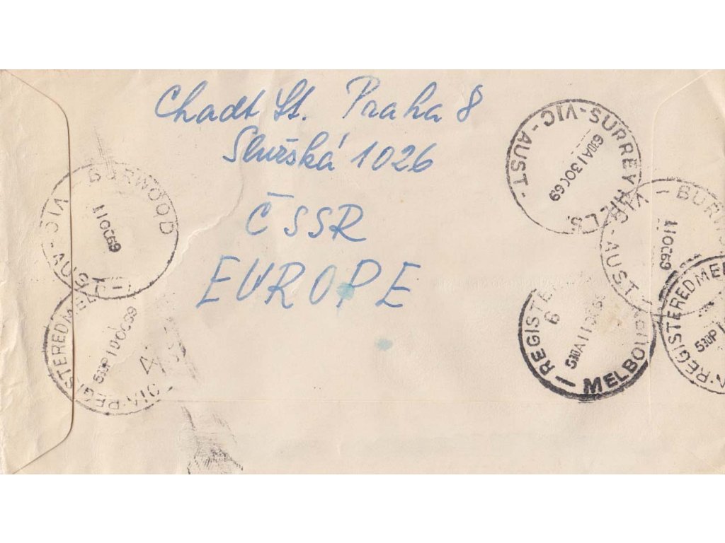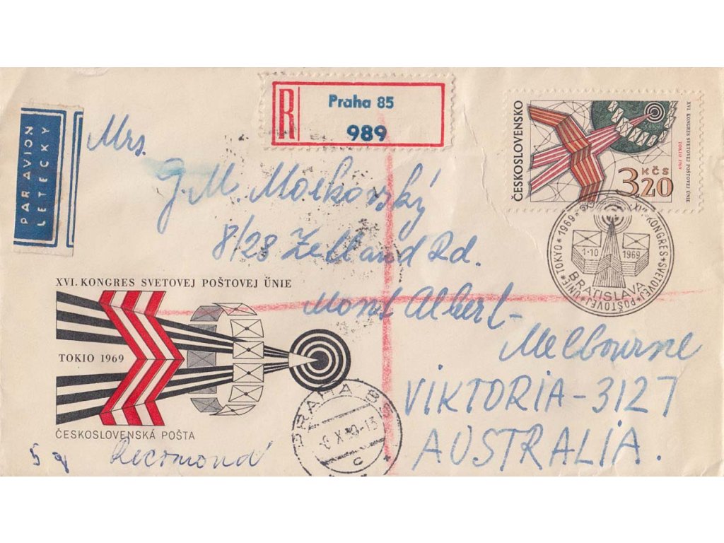 Poštovní celistvost, 1969, R-let. FDC zaslaná do Austrálie, zajímavá destinace, stopy stáří a poštovního provozu, omačkání