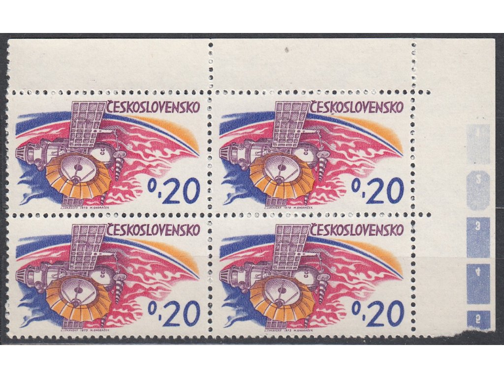 Poštovní známka 1973, 20h Vesmír, rohový 4blok s DV na ZP5/1 - 2 čárky pod 1 písmenem "K", Nr.2050, **