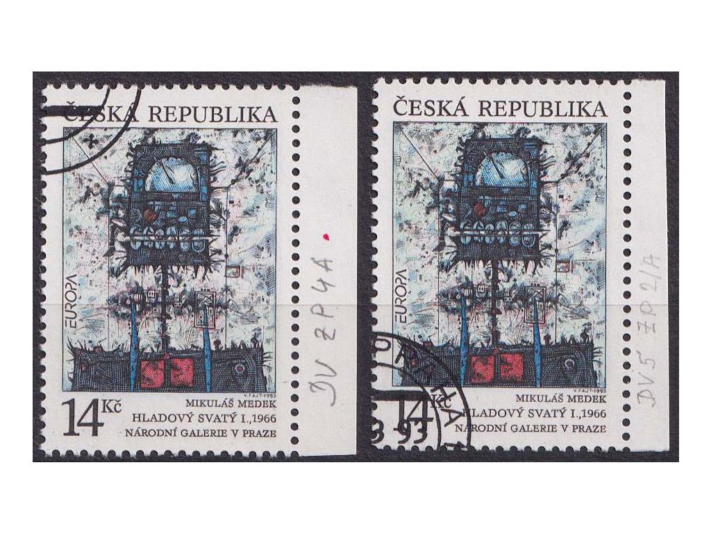 Poštovní známka, 1993, 14 Kč Hladový svatý, DV - černý bod na levé svislé rysce, Nr.5, razítkované, druhá známka je pro porovnání