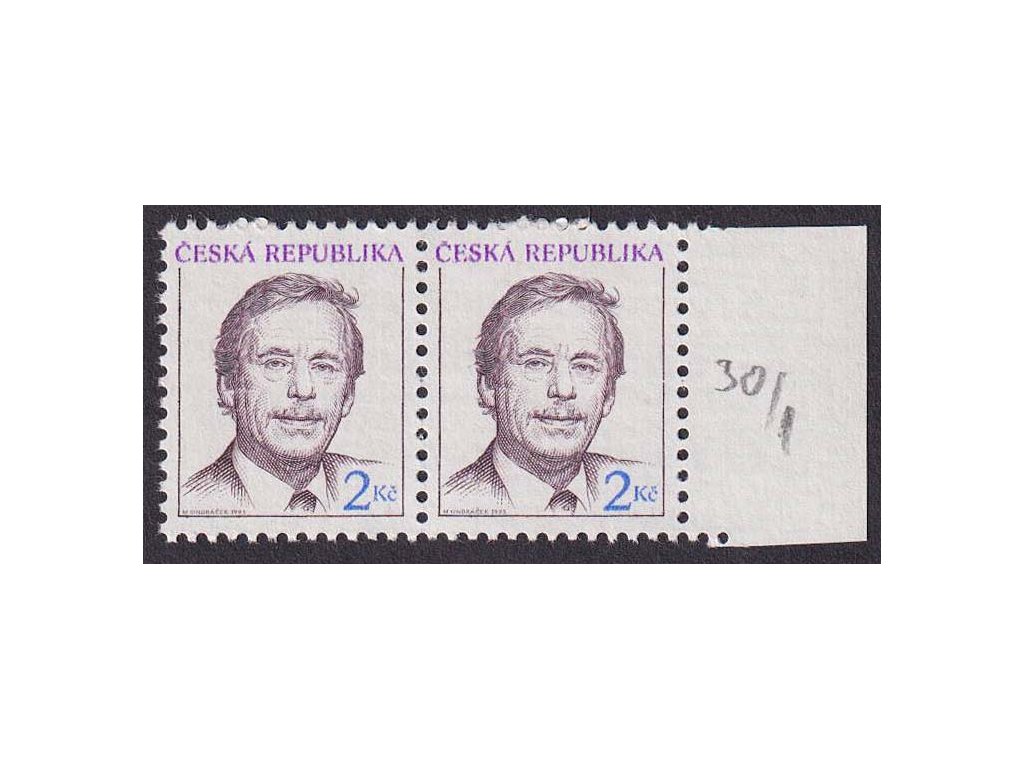 Poštovní známka, 1993, 2 Kč Havel, DV - hnědá ryska nad okem, Nr.3, ** , ZP 30/1