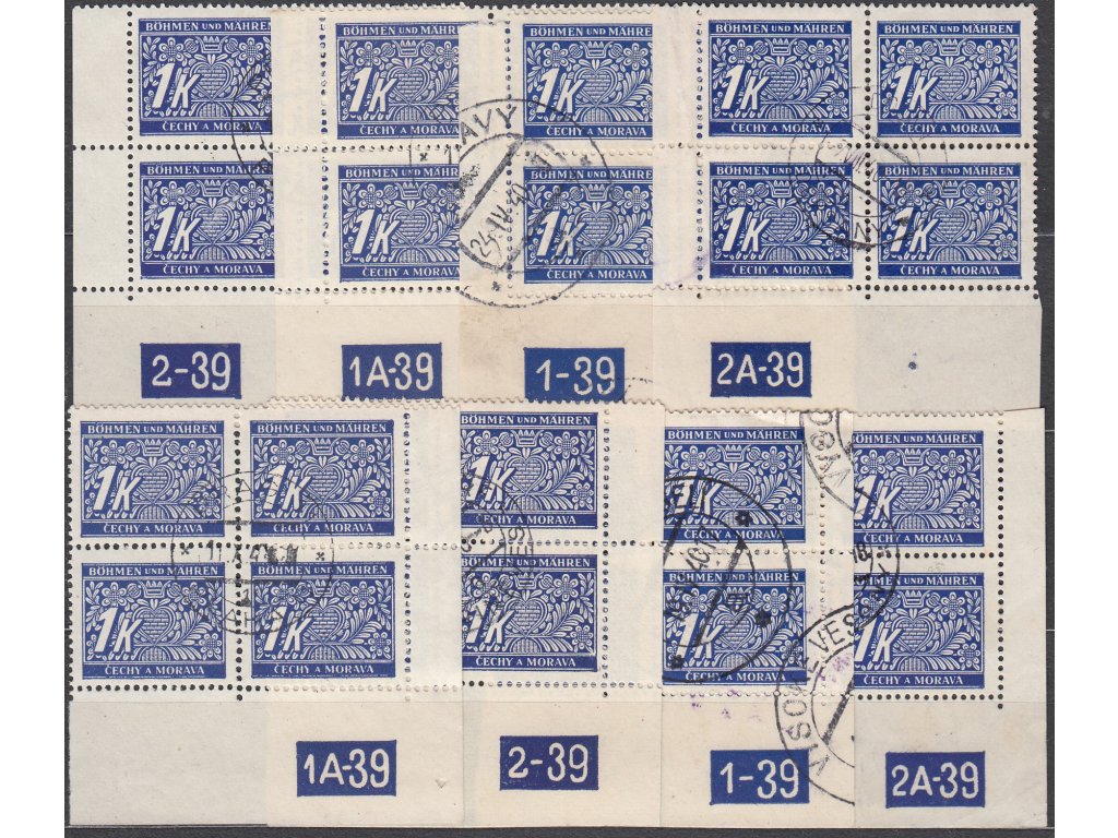 Doplatní známka 1K modrá, 8 ks roh. 4bloků, různá DČ a varianty okrajů, Nr.DL9, razítkované